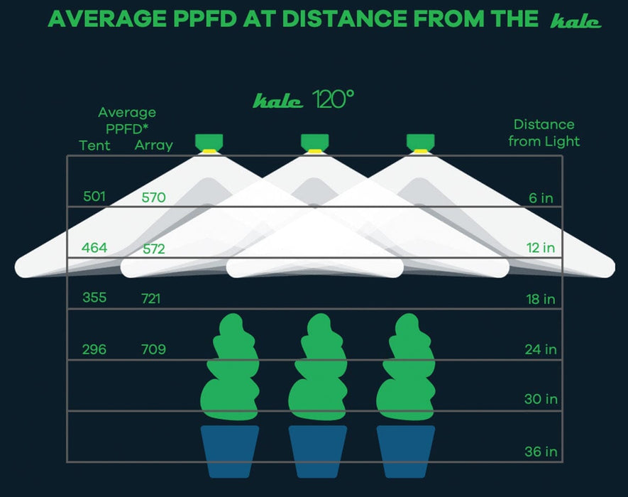 The Kale II features the Conic 120° optic, designed for vertical racking and low-ceiling grow spaces, ensuring equal-intensity light from all angles and mimicking natural sunlight for consistent growth across the entire canopy.