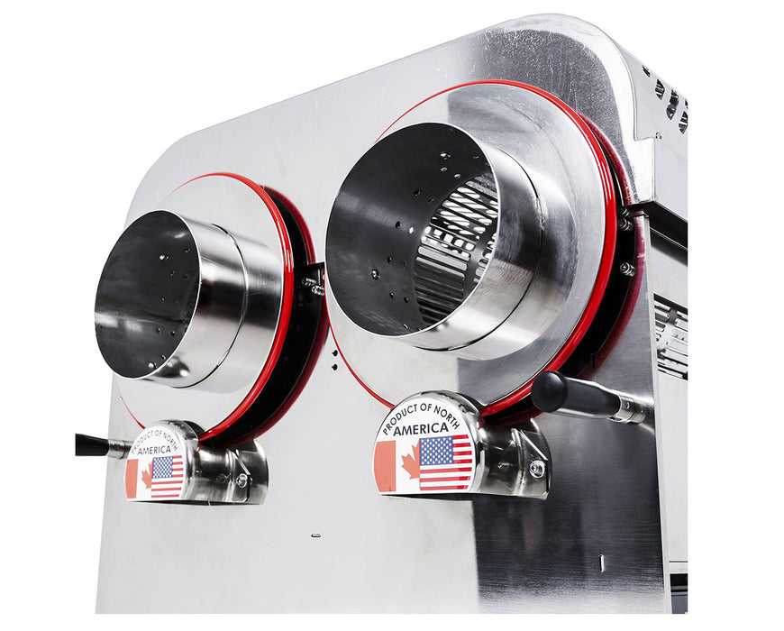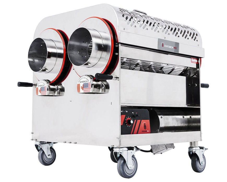 Close-up of dual stainless steel tumblers on the CenturionPro Gladiator SS, with 'Product of North America' label beneath.