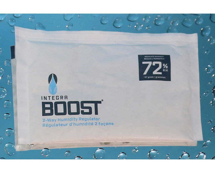 Use our 67-gram Integra Boost 2-way humidity control packs to control moisture in an enclosed area. Our patented technology will either release or absorb moisture, maintaining relative humidity at 72% in a contained environment.