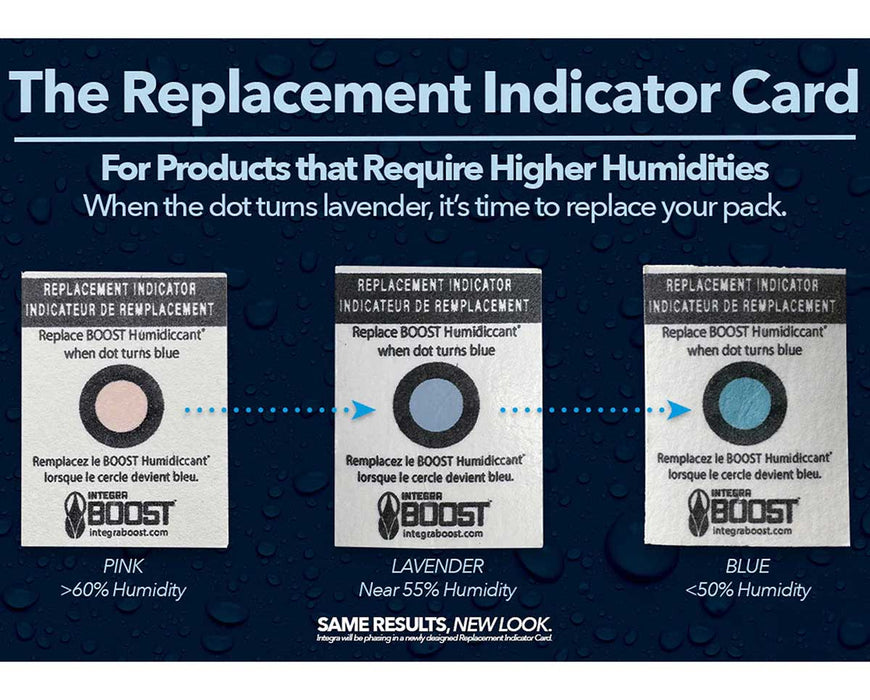 In every Integra 8g RH 69% RETAIL pack, we include an easy-to-use and accurate Humidity Indicator Card. Replace the pack when the card's dot turns a vibrant blue color.