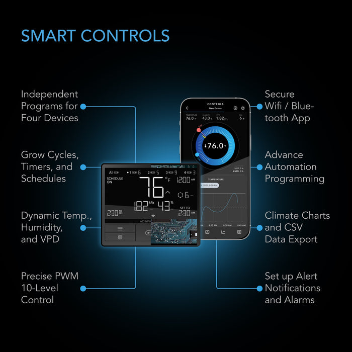 Timer, cycle, and schedule modes add custom on-demand activation for a variety of indoor growing uses. Securely connect to the AC Infinity app via WiFi to remotely access your indoor grow system from anywhere outside the boundaries of your home, unlocking advanced programs, alerts, notifications, and historical charts.