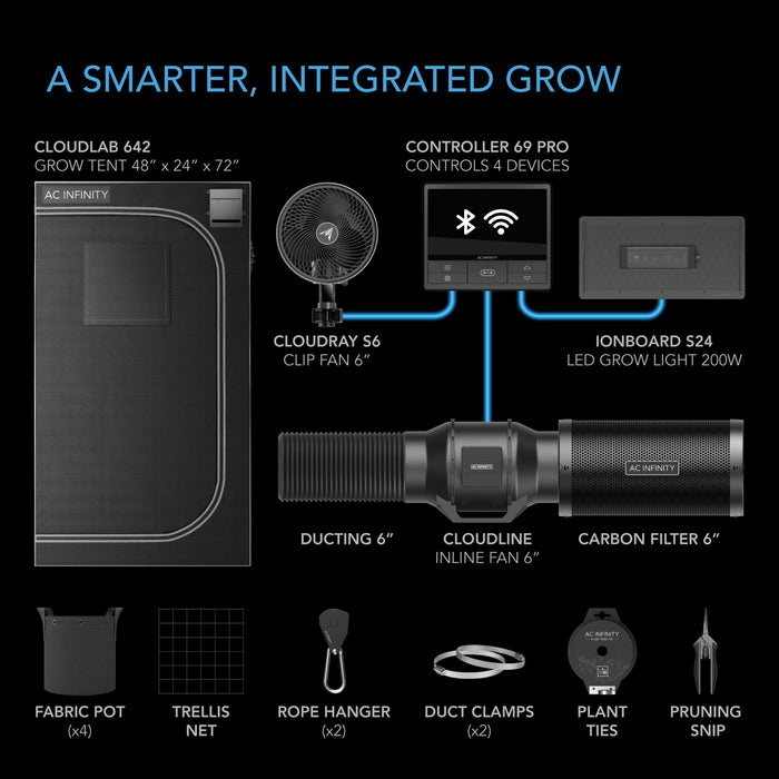 AC Infinity Advance Grow System B24 is a grow tent system with intelligent controls to manage your grow environment and ensure ideal growing conditions for a successful harvest. The inline fan, carbon filter, and ducting manage your tent’s climate conditions by routing heat, humidity, and odor away from it.