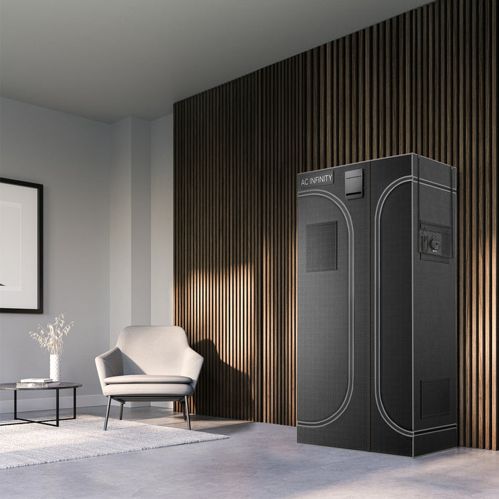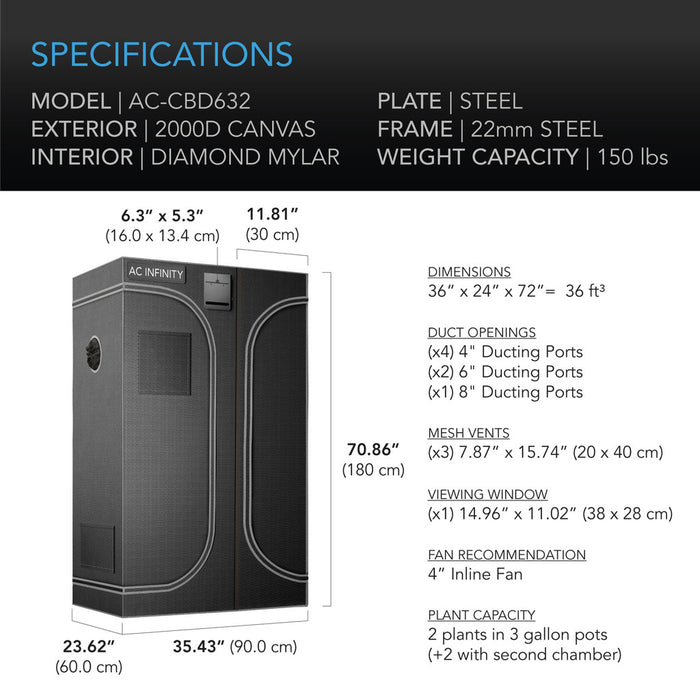 AC Infinity CLOUDLAB 632D is a grow tent designed to grow plants indoors by providing complete control over climate conditions. It features a secondary chamber where the top half is used for plants in their vegetative stages, and the bottom half for those in their seedling stages. This grow tent uses a waterproof Oxford canvas with a 2000D thickness for higher durability and light-proofing. Cross-patterned diamond mylar lines the surface of the inner walls, which will reflect and maximize output from your grow light.