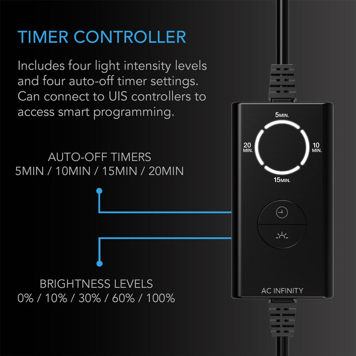 This 16" LED light bar kit includes an intuitive smart controller with adjustable lighting settings. It features four intensity levels and auto-off programming in 5, 10, 15, and 20-minute increments. The light can also connect to our UIS controllers to integrate with other grow equipment and access Wi-Fi-enabled app control.
