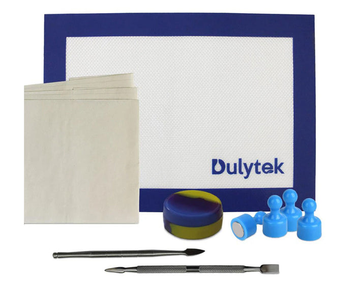 Equipped with 2.5" x 3" dual heating plates and a maximum temperature of 356°F (180°C), the DM800 ensures efficient heat distribution for optimal extraction. The temperature controls located at the back of the press provide easy access, while the convenient carrying handle makes it perfect for portable use. It even includes a starter kit with all the necessary tools and accessories to get you pressing right away, such as stainless steel tools, a silicone mat, parchment paper, and a storage jar.