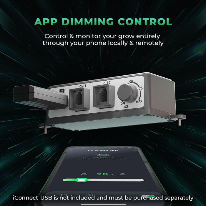 FC-E1500 LED grow light with 2.8 µmol/J efficiency, Bridgelux diodes, and smart dimming. Built for 1–3 plant grows in compact tents.