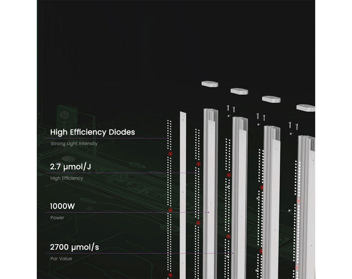 Maximize yield in 5'x5' grow tents with full spectrum lighting, smart dimming, and efficient low-heat 1000W power.