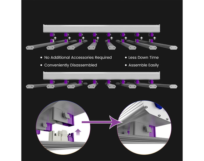 This is a no-fuss, pro-level grow light with detachable bars for easy setup and a full aluminum body that keeps heat low and durability high. Chain up to 75 fixtures for large vertical farms or scale a single tent with rock-solid reliability. With built-in dimming and smart group control, it's the workhorse solution for serious growers who need power and flexibility without breaking the bank.
