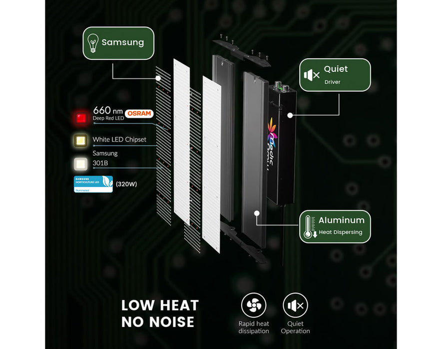 Boost small grow tents with full spectrum Osram LEDs, smart dimming, and energy-saving passive cooling technology.