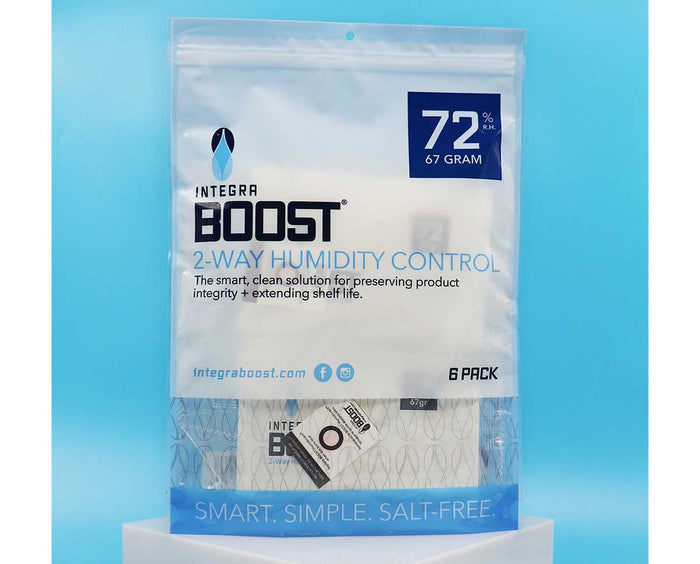 Use our 67-gram Integra Boost 2-way humidity control packs to control moisture in an enclosed area. Our patented technology will either release or absorb moisture, maintaining relative humidity at 72% in a contained environment.