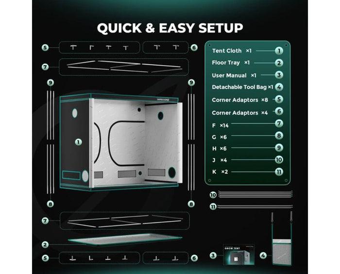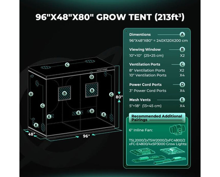 The Mars Hydro 4x8 Grow Tent (96"x48"x80") is designed to give indoor growers full control over their environment. Built with a robust metal frame that supports up to 270 lbs, it’s strong enough to handle heavy grow lights, ventilation systems, and trellis setups. The tent's thick 1680D canvas is tightly stitched and sealed to prevent light leaks, helping you maintain a stable grow cycle from seed to harvest.