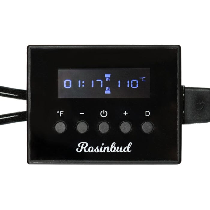 2. Turn on the Rosinbud M1 by pressing the power button on the controller (but first make sure that the controller is connected to a power source). The top and bottom platens will automatically heat to 95°C (122°F), which takes around 30 seconds.